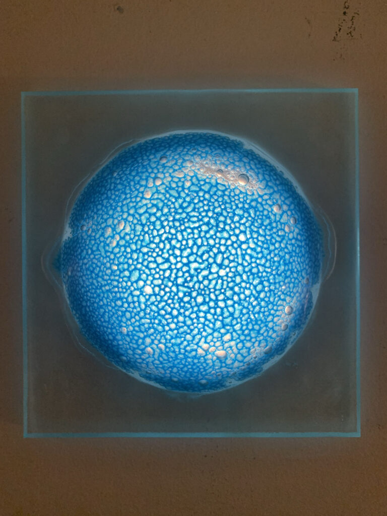 A central aspect of the research concerns the chemical reactions that occur inside the glass during heating. Some materials release gases, expand or react with the surrounding glass, producing bubbles, textures or crystalline formations. Different proportions of each material are systematically tested to evaluate their compatibility with the glass matrix.