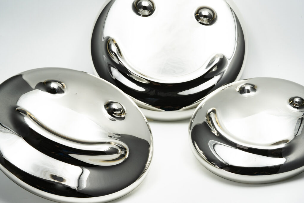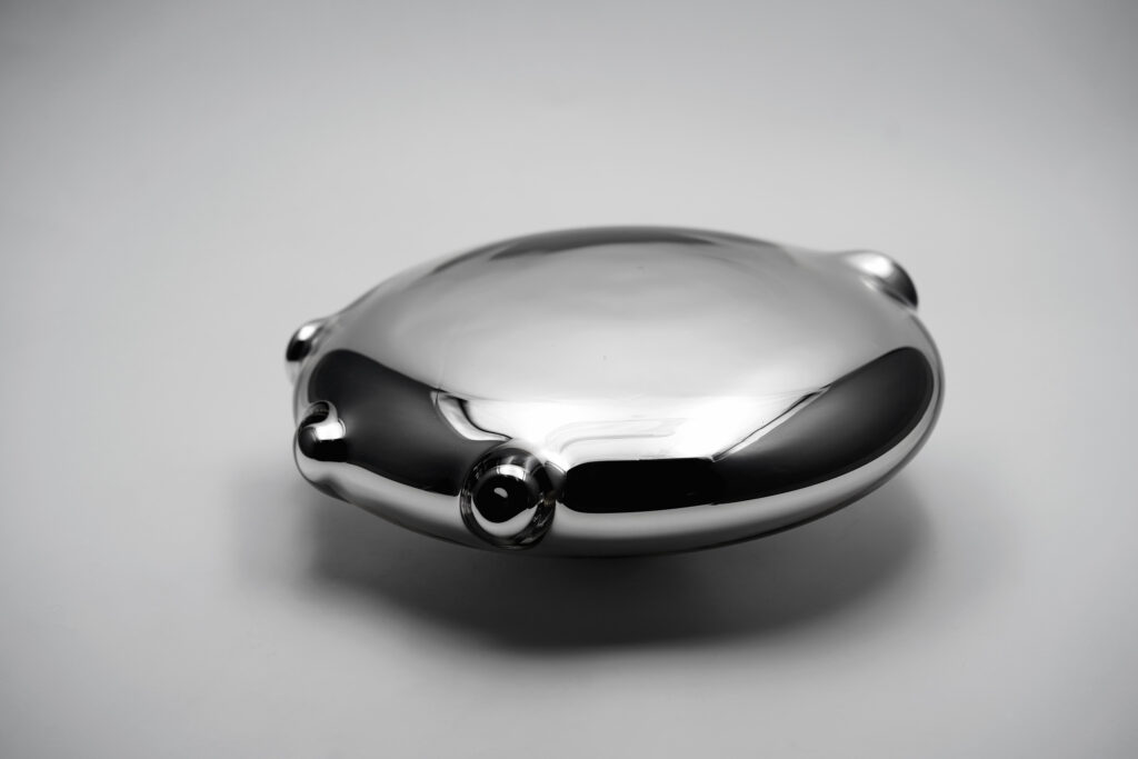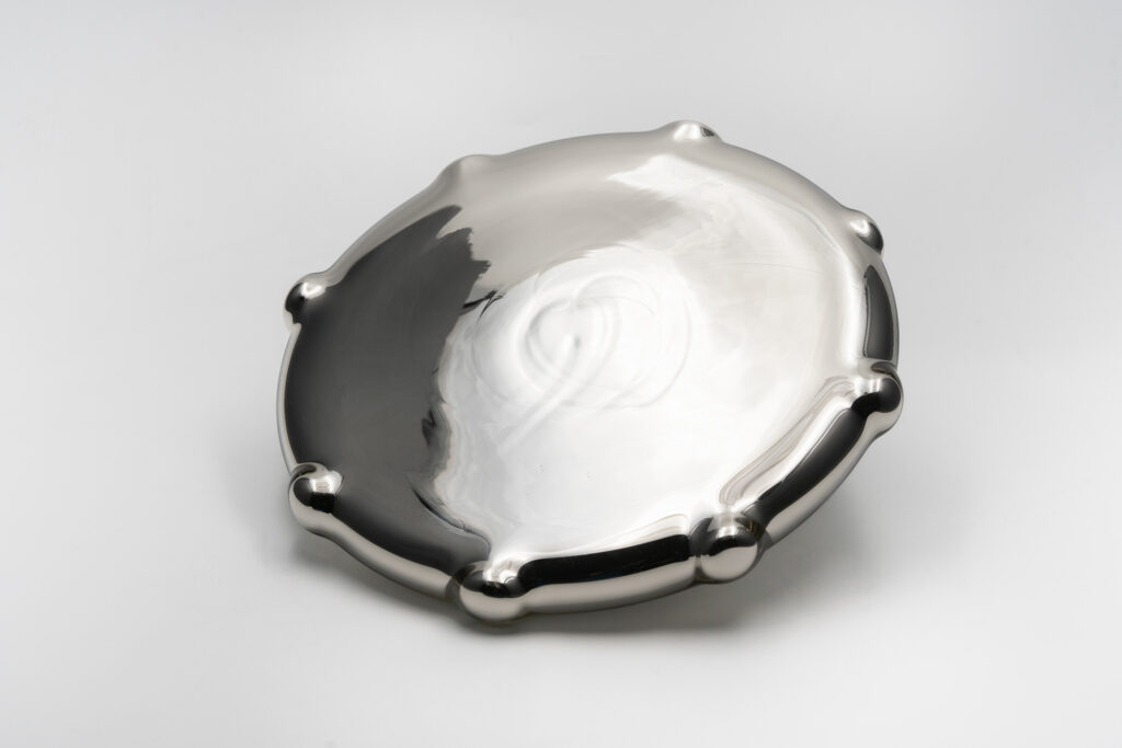 Each piece begins as a blown glass volume whose surface is subtly manipulated during the forming process. Once cooled, the interior of the glass is silvered, transforming the object into a reflective surface while preserving the variations created during blowing.